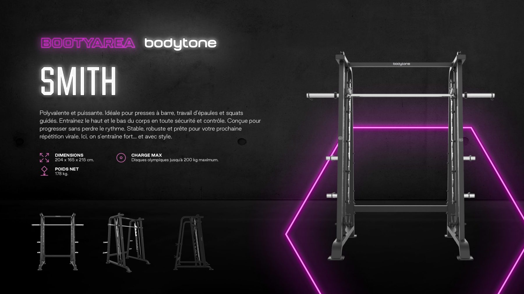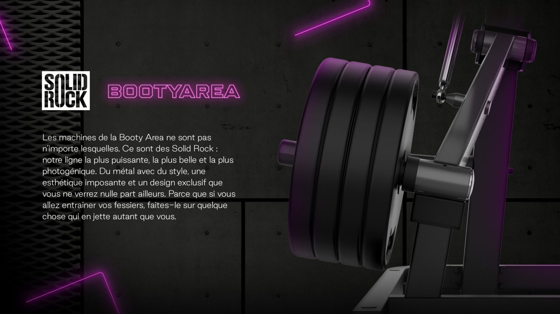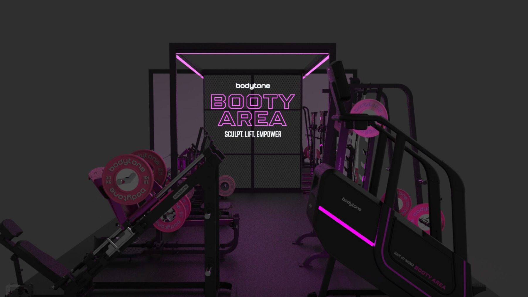 Un espace complet orienté bas du corps + contenu social : stations de force, poulies avec miroir, et une scénographie (structure, néon, lumières, miroirs) pour créer une zone signature.