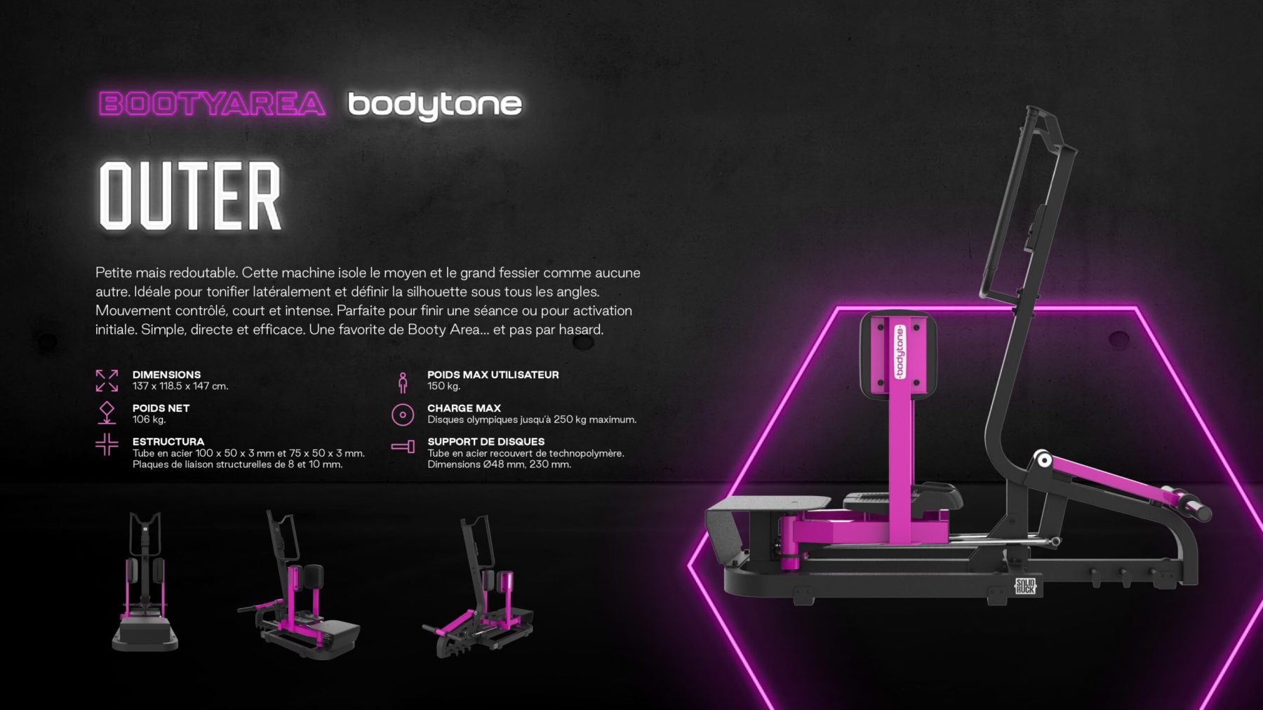 | Outer (abducteurs) | 137×118,5×147 cm | 106 kg | 250 kg |
