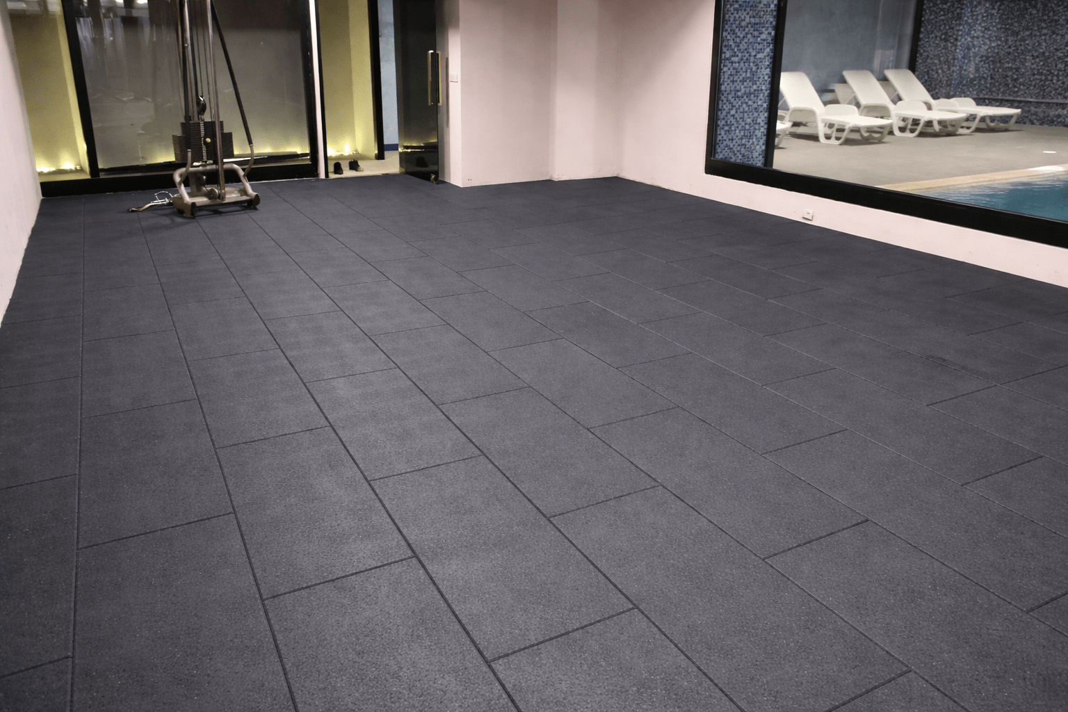 Les tapis de course, vélos et elliptiques occupent des emplacements rectangulaires. Le format 50×100 cm épouse mieux l’emprise au sol des machines que le format carré 100×100 cm. La densité de 1 050 kg/m³ offre une stabilité maximale sous les pieds des machines — les dalles ne se déforment pas sous la charge statique.