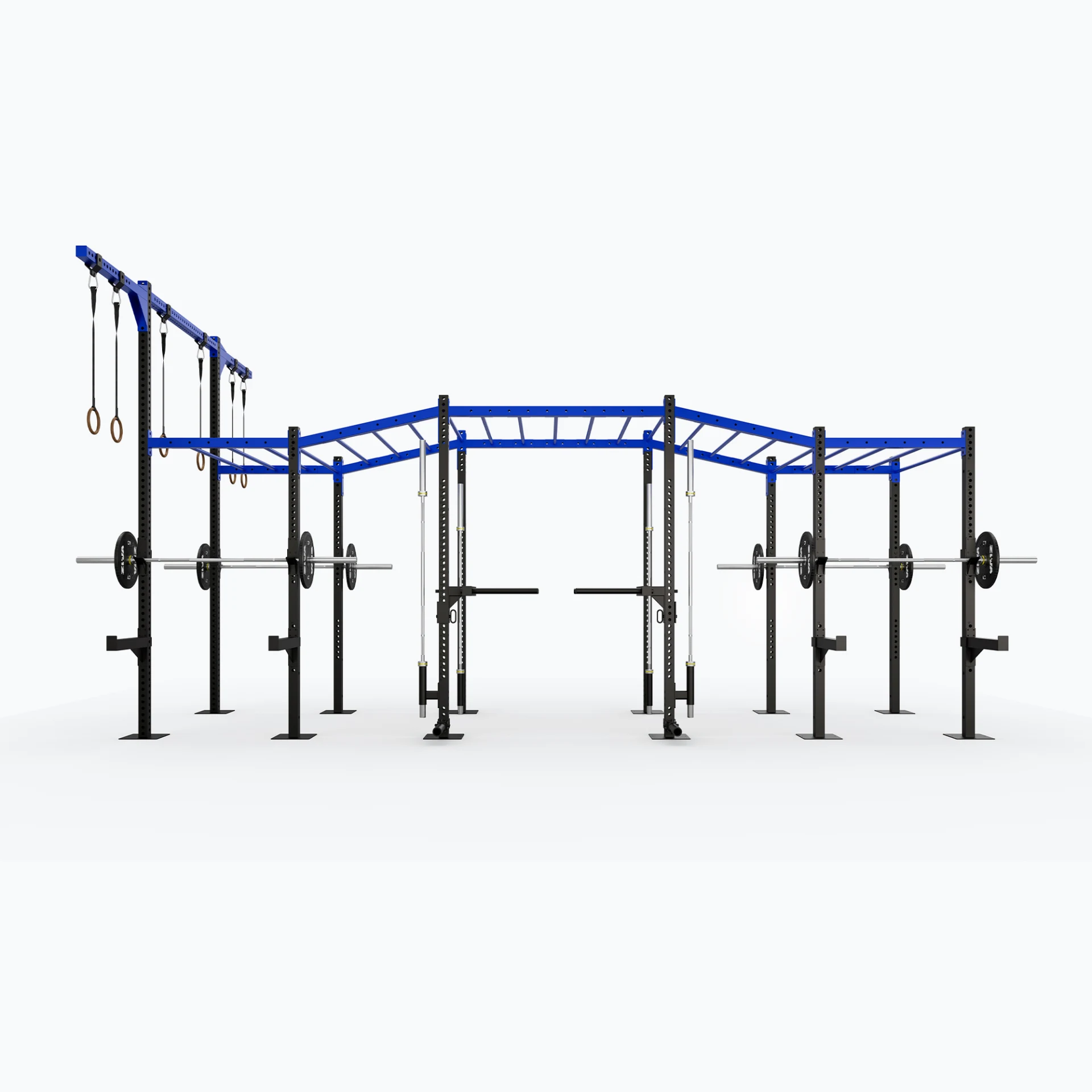 Pensé pour une utilisation en extérieur, ce rig combine solidité structurelle, résistance aux intempéries et polyvalence d’entraînement, avec des barres monkey multi-hauteurs, des demi-racks, des bras de sécurité, des points d’attache pour corde et une station de stockage intégrée.